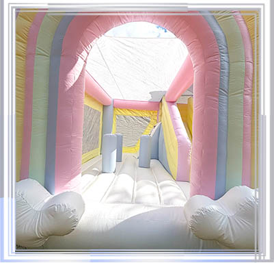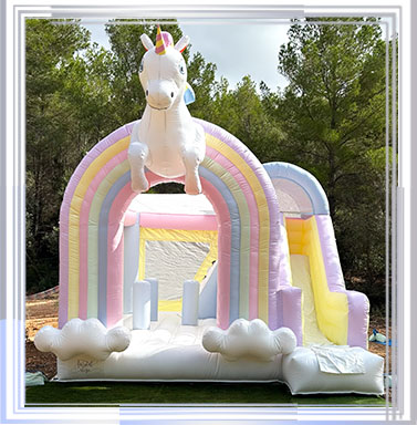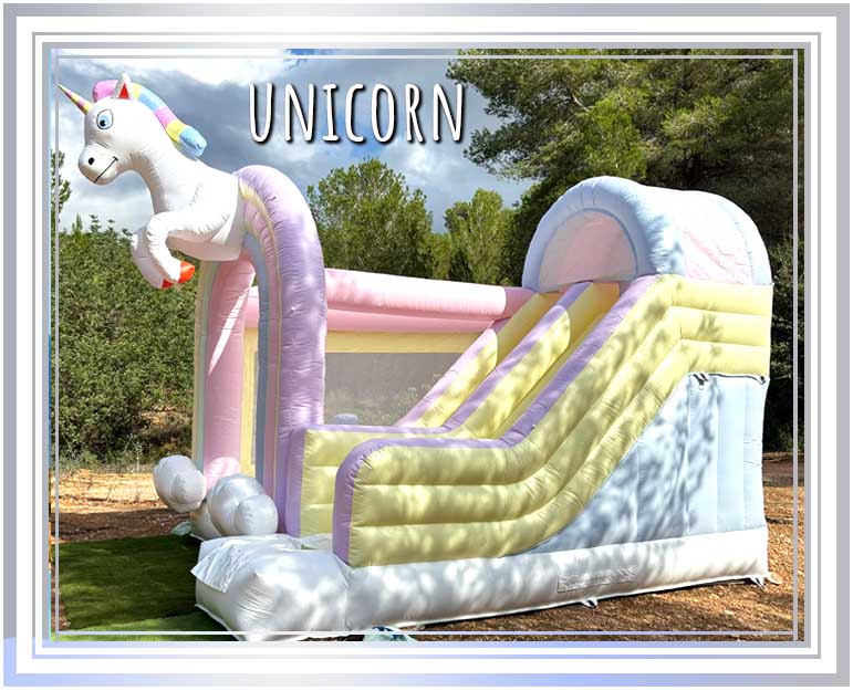 A pastel coloured dream Unicorn bouncy castle with slide!