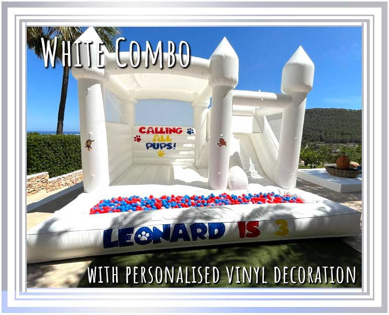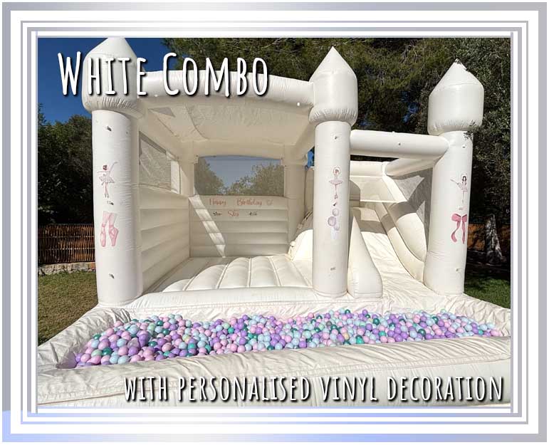 Beautiful white 3 in 1 Combo bouncy castle is a perfect compliment to any of our softplay packages with its open plan bounce house, fun slide & front ball pit!