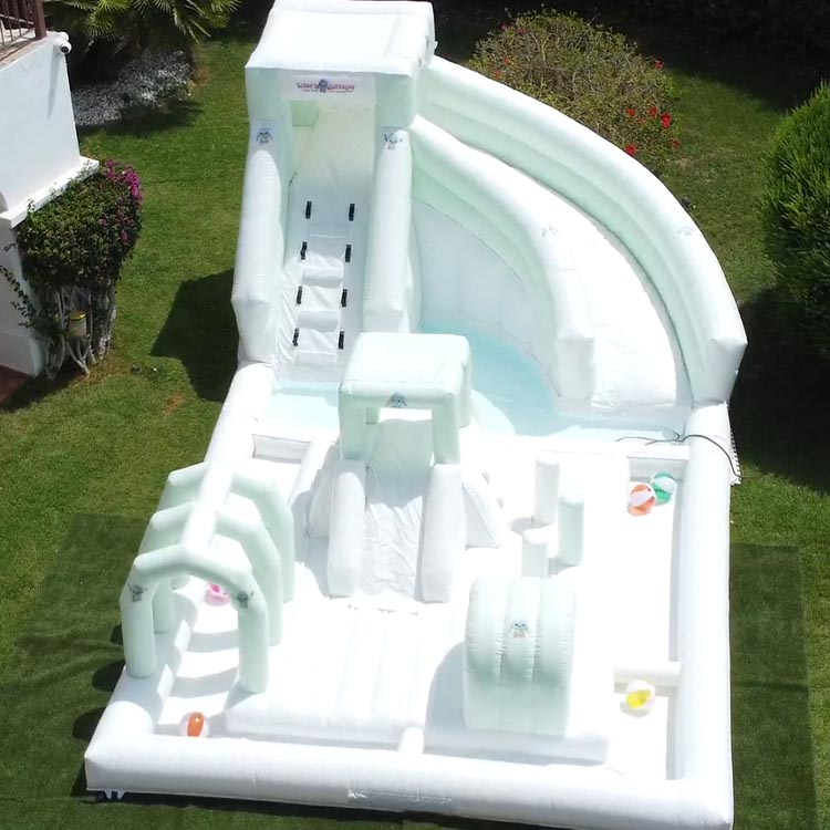 We have inflatable dry/wet slides – which have their own pool attached and are installed on any flat ground.